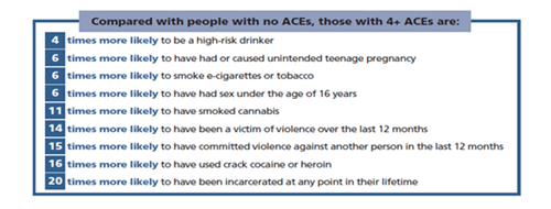 The National household survey of adverse childhood experiences in England found 9% of English adults had experienced four or more ACEs. Research in Wales found 14% of the population had experienced 4 or more ACEs.