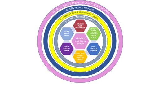 The Vanguard is made up of seven existing services, ‘the pathways’, including CAMHS, Youth Justice Services, schools and Liaison and Diversion, who have additional funding to enhance their existing work with CYP with complex needs in a trauma informed way. This provides a real opportunity to embed cross-agency working between statutory services, third sector organisations, across multiple local authorities whilst embracing co-production in the real-world complexity of CYP services. Barnardo’s young advisors with lived experience continue to support the co-production of the project.