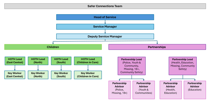 The Safer Connections team is responsible for responding to HOtH through a contextual safeguarding approach, working alongside social care teams and wider partnerships to address risks that emerge in peer groups, schools, public spaces and online environments, where traditional safeguarding frameworks may struggle to intervene effectively. The team supports both statutory and partnership services to target the social conditions that enable abuse, aiming to create safety within the environments children inhabit through prevention, disruption, support and recovery.